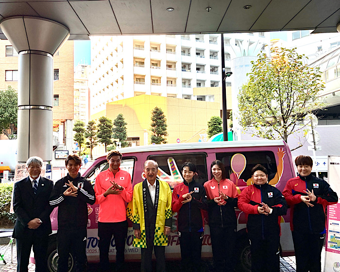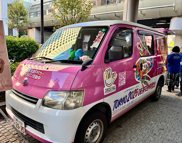 これが噂のデフリンピックのキャラバンカー! 「ピンクでかわいい」とか「けっこう派手で目立つよ」などと聞いていましたが、まさにその通り。来月11月15日から始まる東京2025デフリンピックをPRし、盛り上げようと、3月頃から、北と南から2台のラッピングカーが出発して日本全国を駆けまわり、南からのキャラバンカーが東京にたどり着いているようです。
