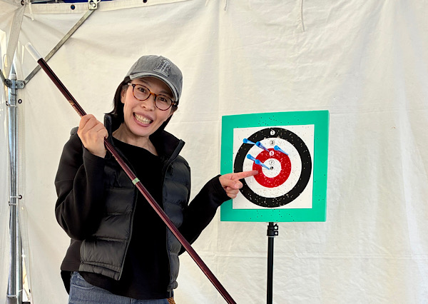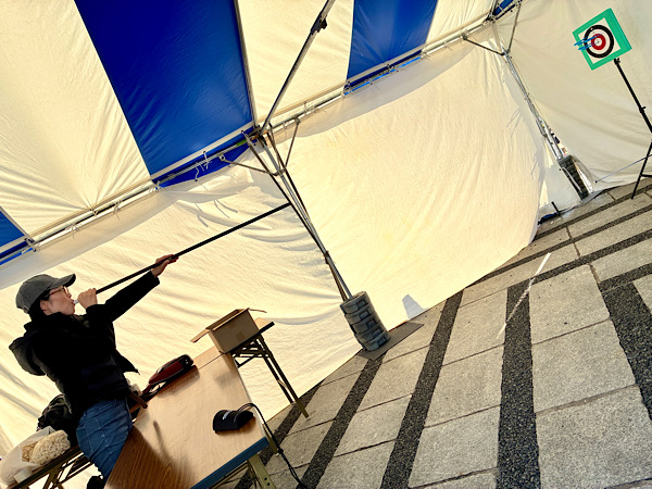 吹き矢も体験した。年齢、性別、障害の有無にかかわらず、誰もが一緒に楽しめるように工夫されたユニバーサルスポーツ。